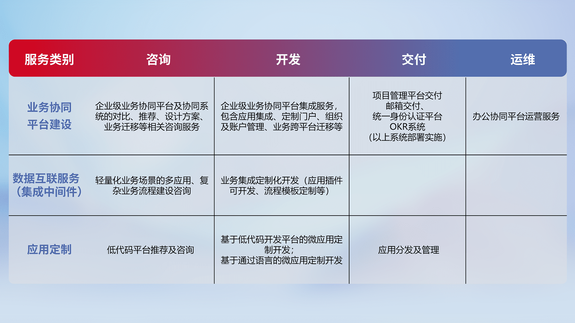 针对钉钉、、、、企微、、IDaas等平台级产品提供产品的规划、、、方案、、交付、、、定制化开发等服务,,实现如统一协同办公、、、智能客户服务、、、、混合会议管理、、、智能数据查询、、等业务场景,,,,实现数字化转型。。。。